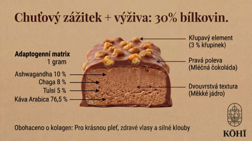 Znáte ten pocit, kdy uprostřed dne nebo před tréninkem dojde šťáva? Hlava nefunguje, tělo si žádá cukr a vy potřebujete rychlý restart. Zapomeňte na běžné sladkosti i obyčejné proteinovky. KŌHĪ Vanilla Focus je funkční adaptogenní snack nové generace, který spojuje prémiovou čokoládu, pokročilou směs bílkovin a unikátní synergickou směs medicinálních hub a bylin. Vytvořili jsme ji pro chvíle, kdy potřebujete maximální koncentraci a stabilní energii bez následného propadu.
