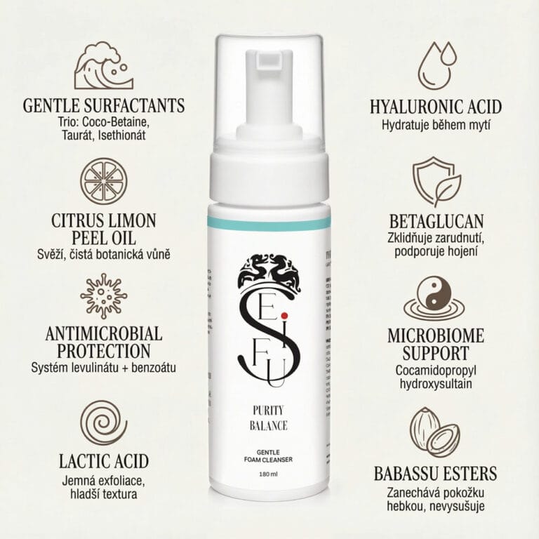 Purity Balance je jemná čisticí pěna s kyselinou hyaluronovou a betaglukanem, která šetrně odstraňuje nečistoty, make-up i kožní maz, aniž by pleť vysušovala. Zklidňuje, hydratuje a zanechává pleť čistou, jemnou a příjemně vyváženou. Ideální pro každodenní použití ráno i večer.